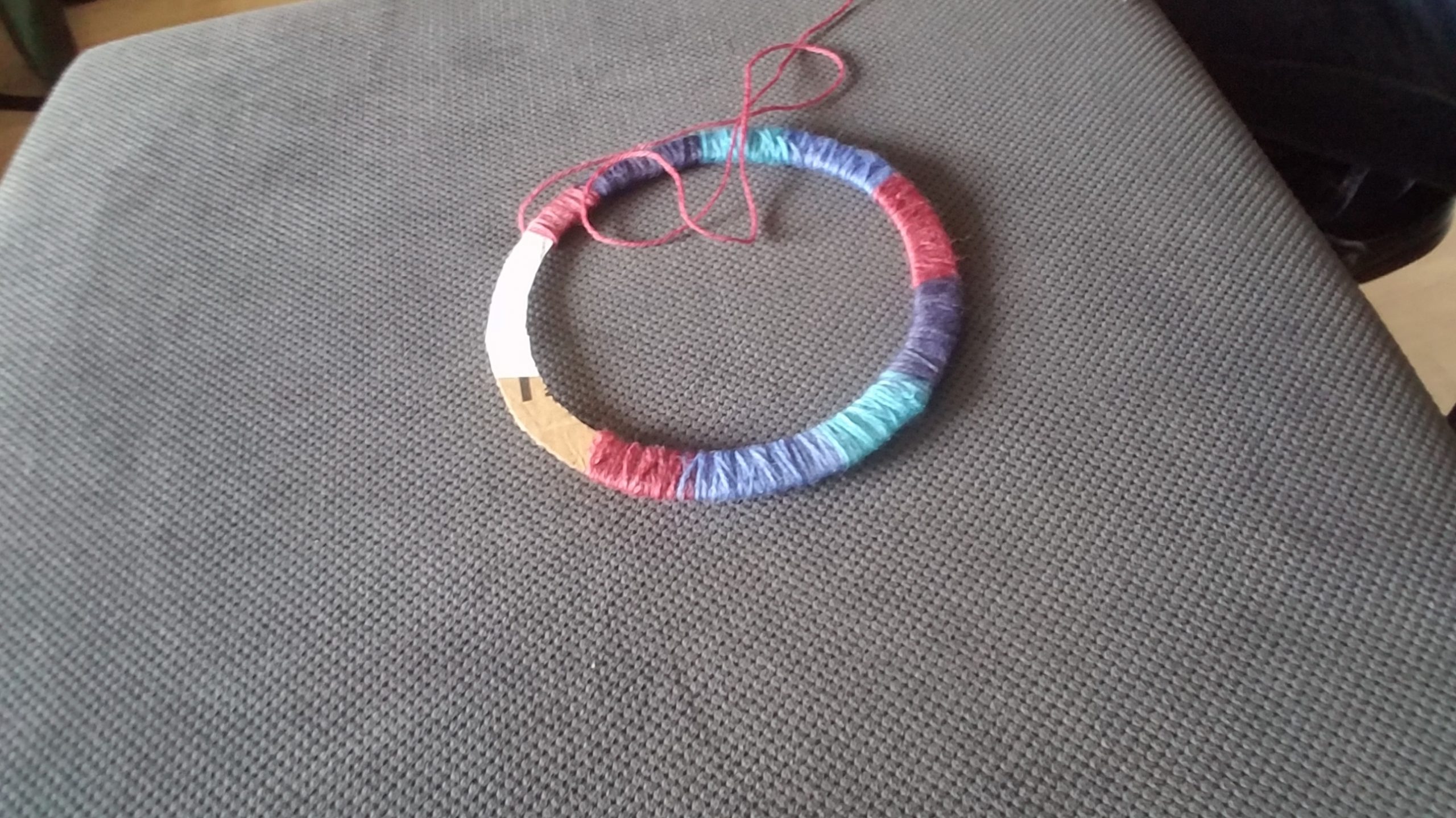 Nun umwickelst du den Pappring schön dick mit Wolle. Das kann je nachdem, wie groß dein Traumfänger werden soll und wie dick deine Wolle ist, etwas dauern. Hier ist Geduld gefragt, denn es soll nichts mehr von der Pappe zu sehen sein. Wenn du fertig bist, kannst du die Wolle am Ende mit einem kleinen Tupfer Kleber am Ring befestigen.